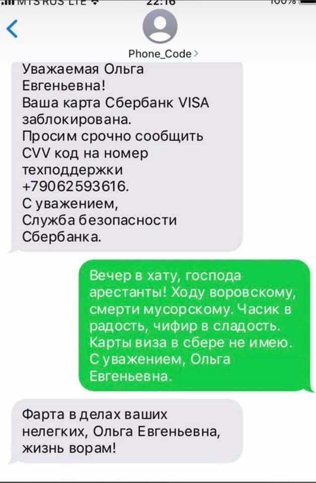 "Хотя прекрасно известно что никакие коды из SMS не надо диктовать" .