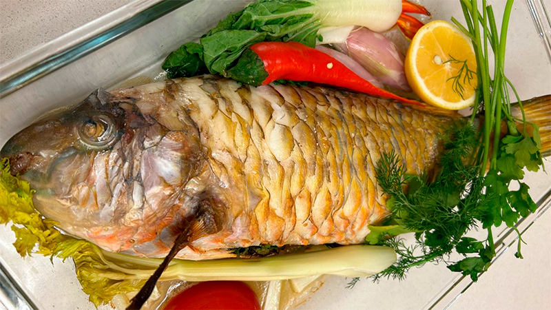Рыбку попугая, значит, с соленым сливочным маслом, чесноком, имбирем и зеленью в брюшке в духовке так испек
