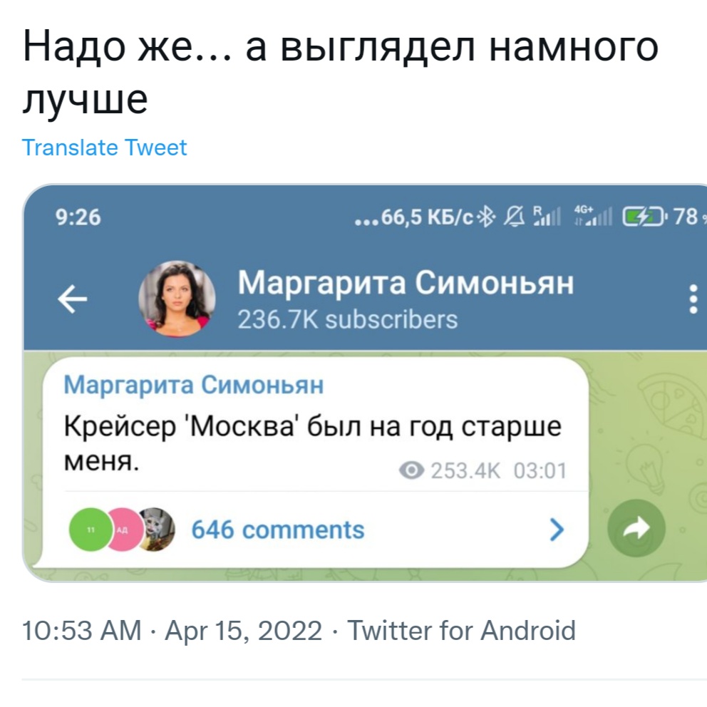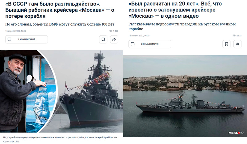 Однако у меня возникает даже ещё более интересный вопрос: на изображении довольно ясно различимы лица моряков - и их наверняка могут узнать родные и близкие (а также определить, служили ли вообще попавшие на кадры хроники люди на погибшем военном крейсере). Честно говоря, с трудом верится, что через два дня после катастрофы, приведшей к взрыву основного боезапаса (неважно, от украинской ракеты или от непотушенного окурка), даже сто человек команды судна могут стоять на плацу без единого следа ранений или измождения.