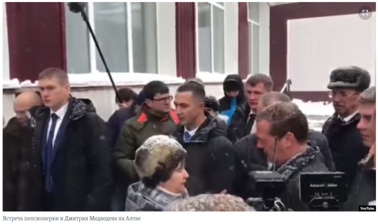Пенсионерка из алтайского села Санниково Татьяна Кадукина встала на колени перед премьер-министром России Дмитрием Медведевым во время его визита в регион. Пожилая женщина умоляла его решить проблему с подачей горячей воды в многоэтажку, где она живет.