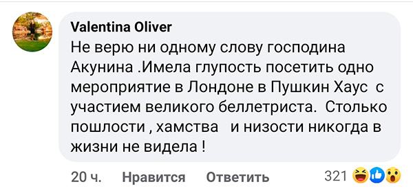 Значимая проблема интернета - он общедоступен, без справки из психдиспансера и аттестата об адекватности. Ну написала и написала; если ты (Алекс, это не тебе!) внутренне убежден в прекрасных моральных качествах г-на Чхартишвили - пройди мимо, не корми тролля. Но нет же, надо раздувать... 😒 Сколько народу теперь знает о существовании Валентины Оливер, а зачем им это знание?