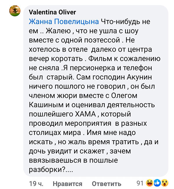 Но теперь эта тетка не верит ни одному слову Акунина. Потому что он сидел в жюри мероприятия какого-то ХАМА.