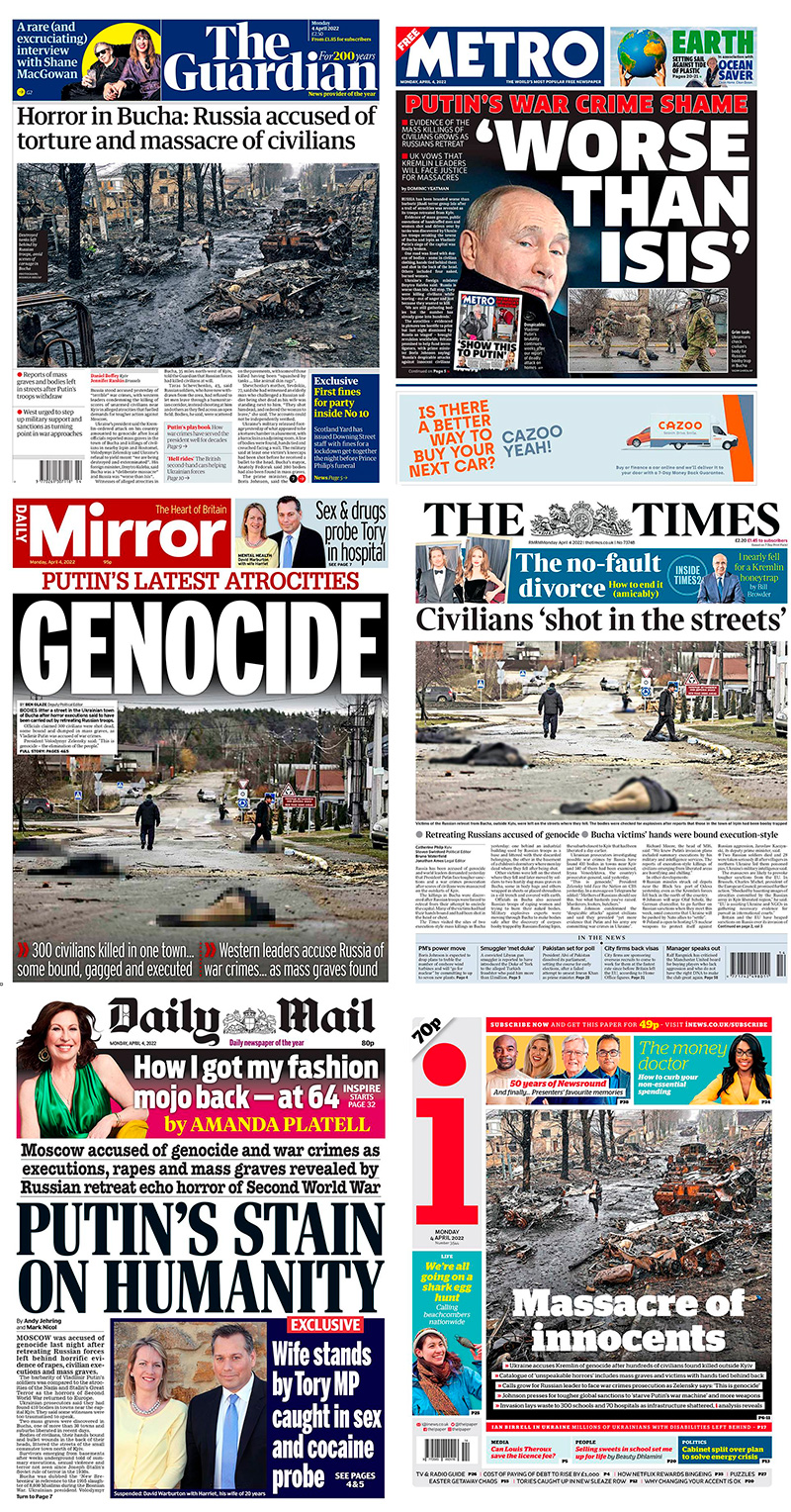 Вот тут выложили "фото со спутника" от 28 марта, типа все "трупы" на видео с машины уже тогда лежали там же и в тех же позах. Они что, людей совсем за дебилов считают? Вы когда-нибудь видели труп, пролежавший не в холодильнике хотя бы день, не говоря уж о пяти днях? То-то же.