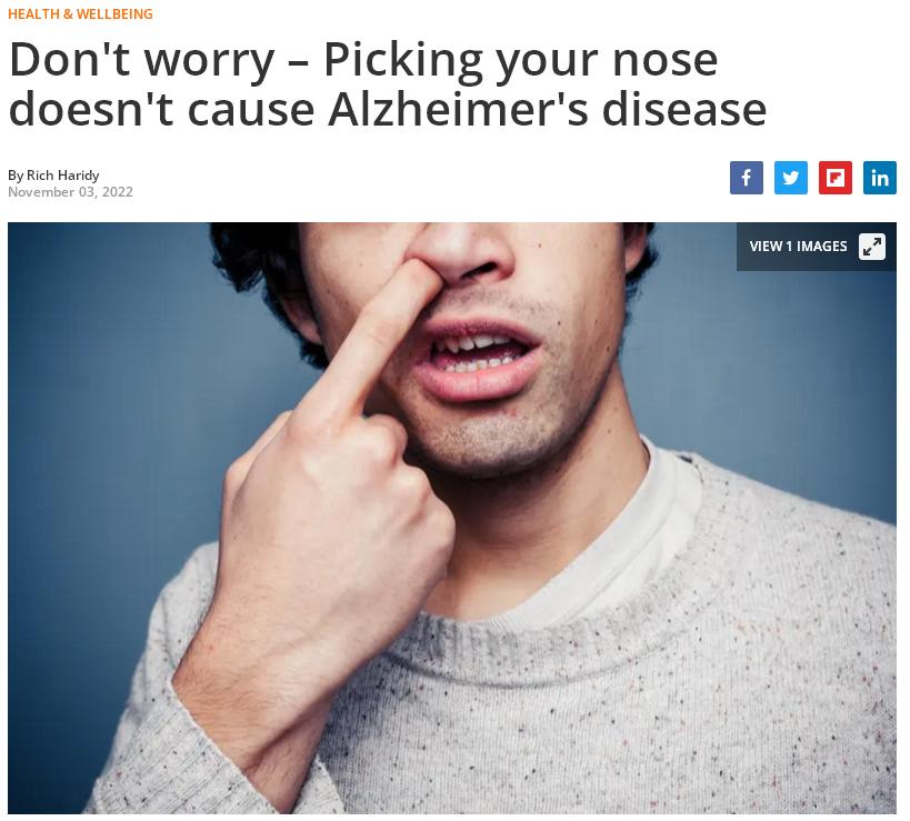 Вопреки опасениям учёных выяснилось, что ковыряние в носу не вызывает болезнь Альцгеймера!