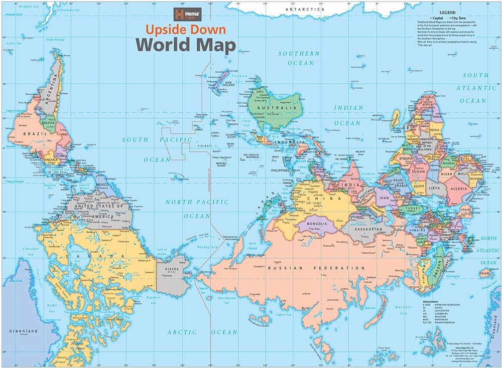 Был в Новой Зеландии. Умотался искать перевёрнутую карту мира. Нашёл к радости своей. Планировал повесить на стену на работе, чтоб все офигевали. Встали проблемы с креплением (она большая). Так и охладел постепенно. И она лежит свёрнутая у меня дома