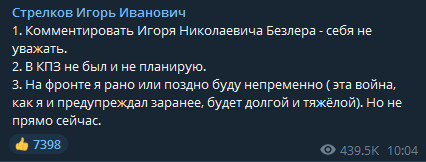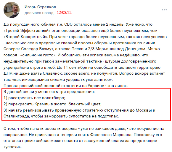 По поводу не берут на фронт, Стрелков утверждает, что просился на любую должность, но указание сверху не брать.