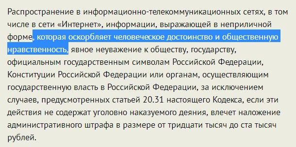 Распространение в информационно-телекоммуникационных сетях, в том числе в сети «Интернет», информации, выражающей в неприличной форме, которая оскорбляет человеческое достоинство и общественную нравственность, явное неуважение к обществу, государству, официальным государственным символам Российской Федерации, Конституции Российской Федерации или органам, осуществляющим государственную власть в Российской Федерации, за исключением случаев, предусмотренных статьей 20.31 настоящего Кодекса, если эти действия не содержат уголовно наказуемого деяния, влечет наложение административного штрафа в размере от тридцати тысяч до ста тысяч рублей.
