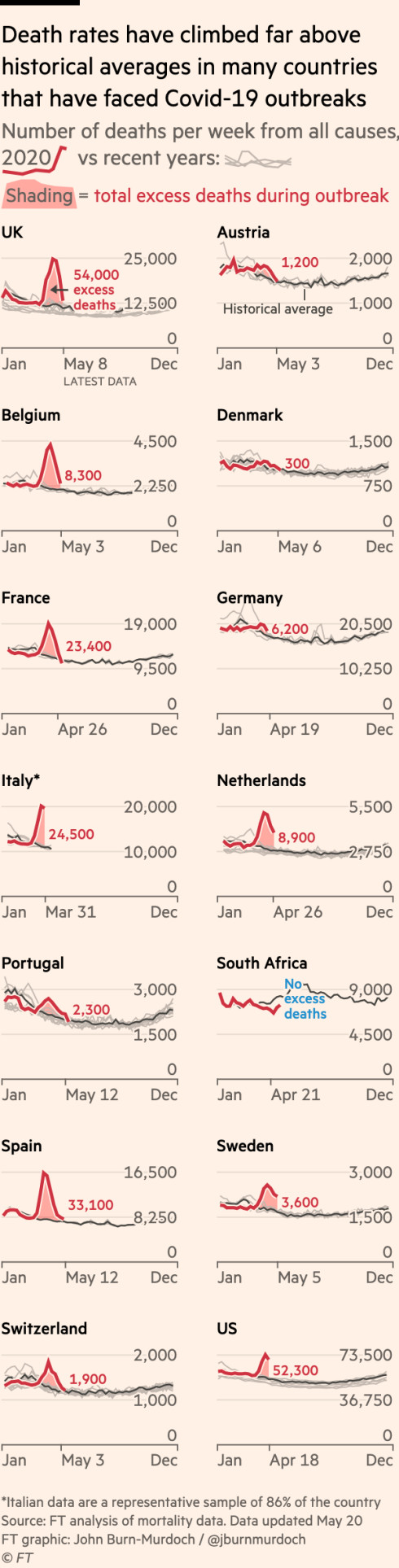 Оставив в стороне дискуссию по поводу многих неадекватных мер испанского правительства, насчет умерших от коронавируса и статистики: можно умерших по причина смерти тасовать налево и направо, но есть такой интересный показатель как "избытосная смертность". Я запостил очень наглядную картинку из Financial times.