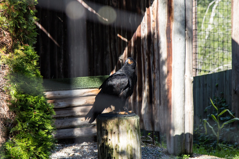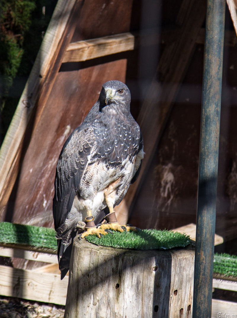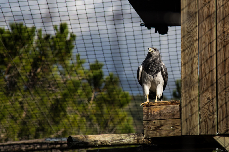 Орлы в здоровенной клетке. Они там не все время находятся: их выпускают полетать. Они считают это место своим домом и не улетают далеко, сами возвращаются.