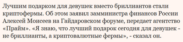 В Москве модно было дарить в 2017 готовую мини-фабрику, смонтированную в морском контейнере, удобно для перездов в поисках дешевого электричества. Но поскольку на волне хайпа не осталось не только видеокарт, но и приличных БП, то и дарить сейчас нечего)))