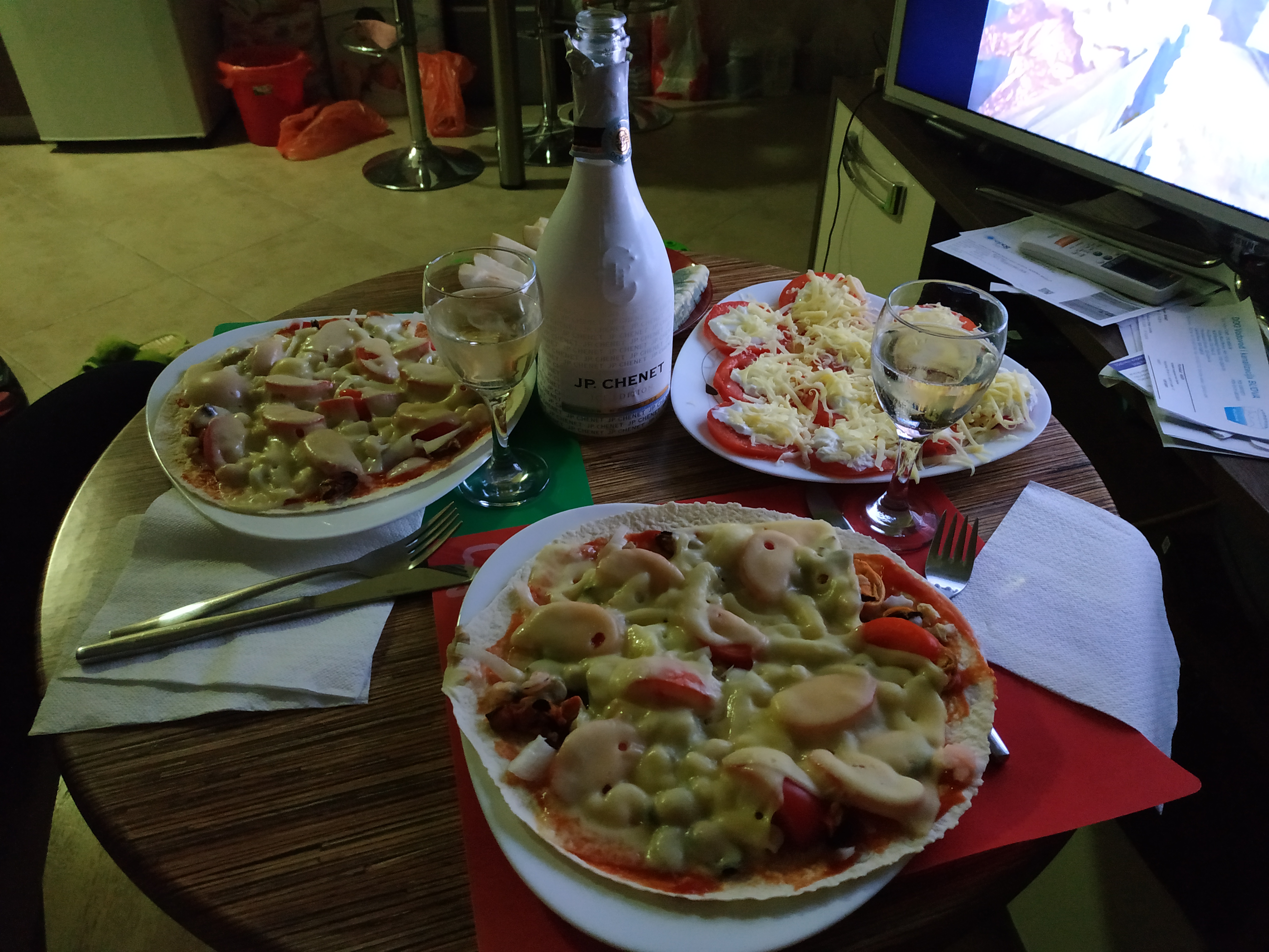 Из напитков, начали провожать год красным вином Zolla Primitivo di Manduria, и на бой курантов - традиционно, шампанское Cavicchioli 1928