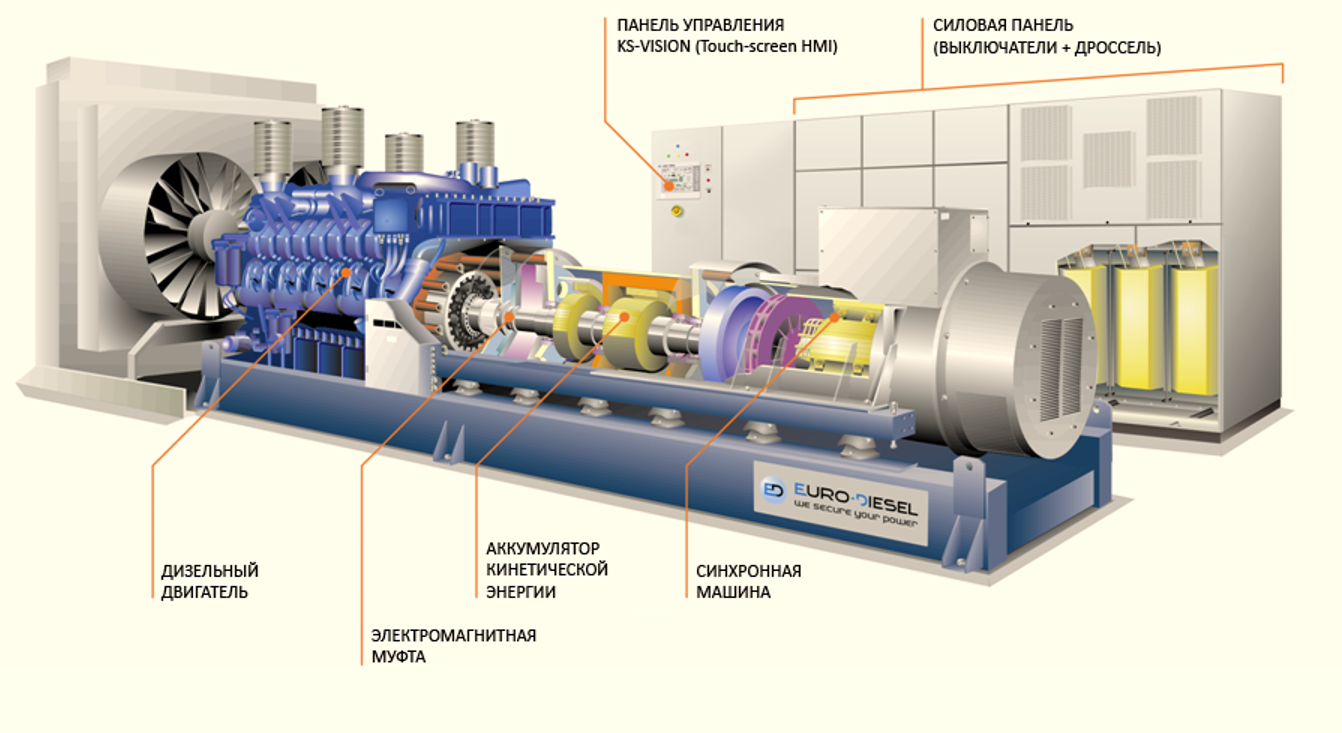 "Электромашина может работать в режиме электродвигателя и генератора. Когда ДИБП питается штатно от города, электромашина – это электромотор, который крутит ротор и запасает кинетическую энергию в аккумуляторе. Если городское питание пропадает, электромашина переходит в режим генератора. Благодаря накопленной кинетической энергии ротор заставляет вращаться основной вал ДИБП, электромашина продолжает работать без городского питания и напряжение на выходе не пропадает. Так обеспечивается бесперебойное питание в дата-центре. Одновременно с этим система управления ДИБП подает сигнал на запуск дизельного двигателя. Та же кинетическая энергия ротора запускает дизель и помогает ему выйти на рабочую частоту. Ротор держит обороты до одной минуты, и этого хватит, чтобы в дело вступил дизель. "