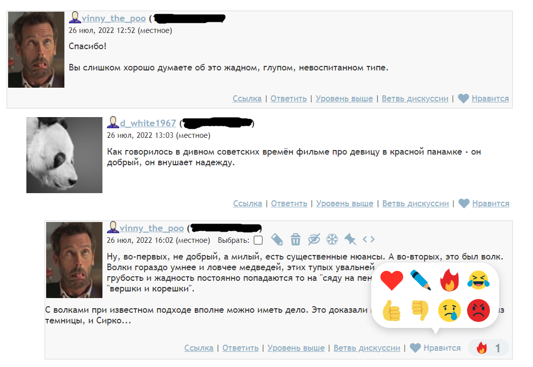 Вот как выглядит блог в новом стиле. Под каждым комментом среди прочих есть слово "Нравится". Если подвести к нему мышку, откроется набор оценок, которые можно поставить комменту, а не просто + и -. Вон, моему комменту уже кто-то поставил "Огонь!" Если я нажму на это поле, то увижу список всех, кто поставил оценки.