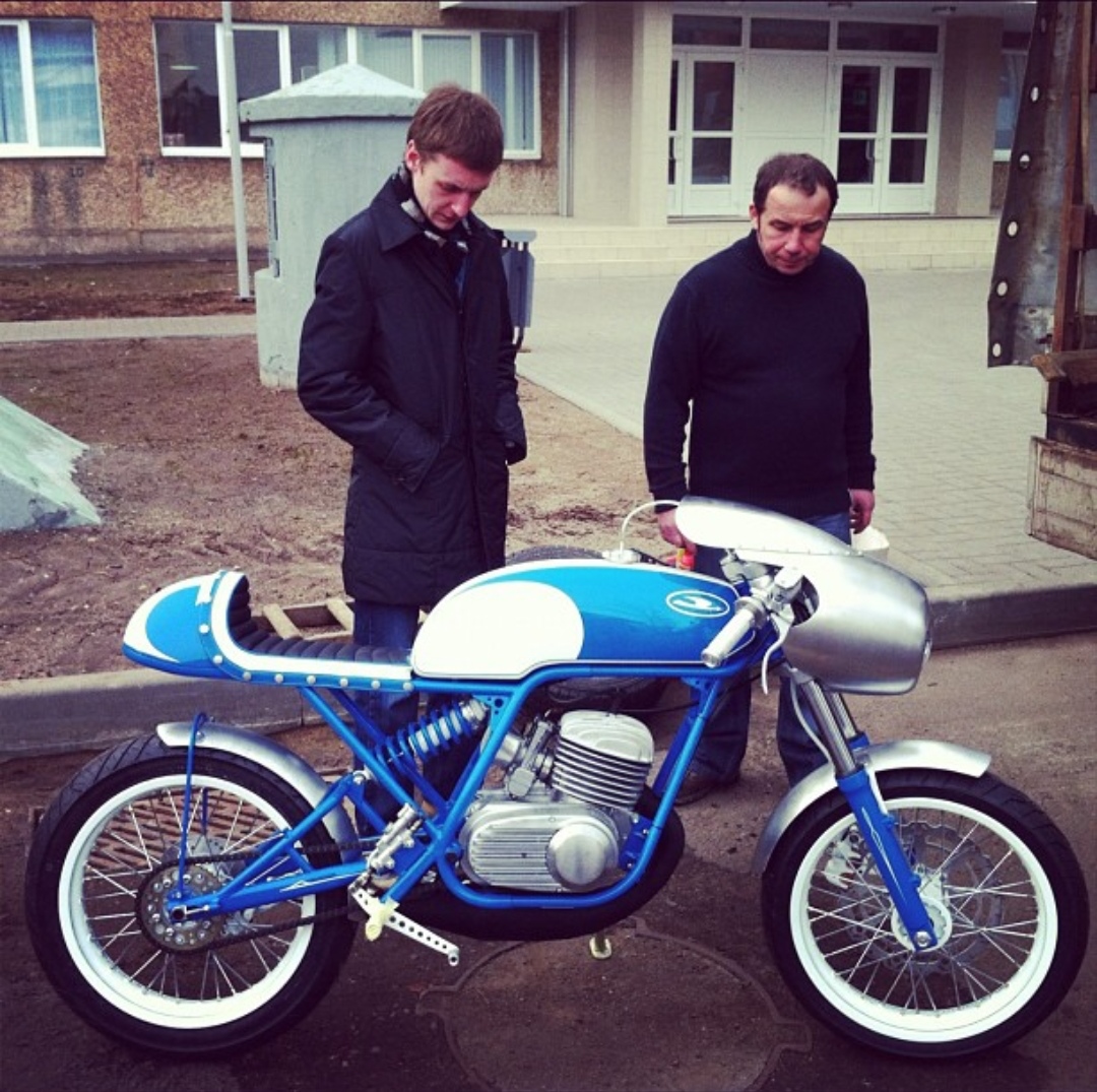 На фото его самый быстрый Минск на погрузке в машину для премьеры на мотовыставке в Москве в марте 2012 года.