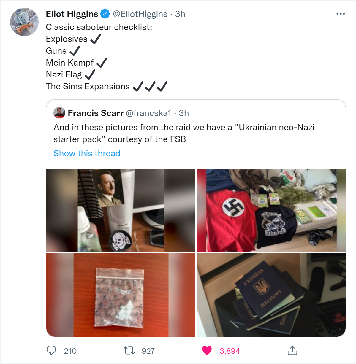 Релиз - супер. Самодельное взрывное устройство - ладно бывает, самодельные "коктейли Молотова" - а что, есть не самодельные? 6 ПМ и ружье с тысячей патронов - патроны для ПМ или ружья? И нахрена, нахрена так много? Граната РГД-5 и наркотики - тут всё понятно. Террористы и неонацисты - нужна граната и наркотические вещества)) Поддельные украинские паспорта - видимо для того, чтобы прозвучало слово Украина🇺🇦 Но, почему - поддельные? Это несколько нивелирует посыл))