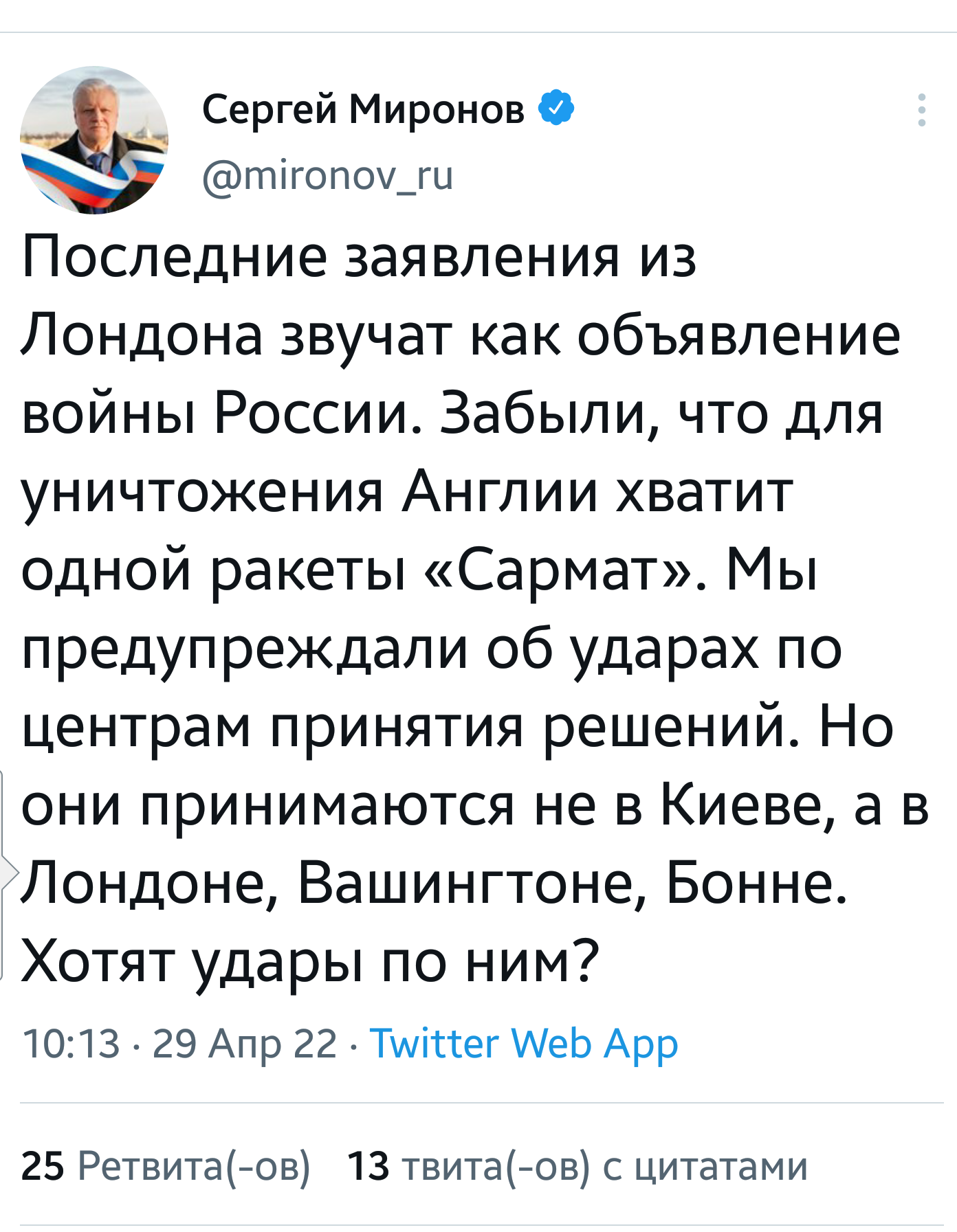 В смысле - надо этому поросшему мхом экс-десантника рассказать, что у Англии 4 ракетных АПЛ, которые никакими Сарматами не уничтожишь, а это 64 Трайдента.