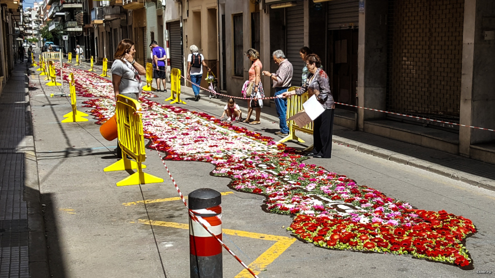 В воскресенье в нашем городке, как обычно каждый год, было перекрыто несколько улиц, на которых прямо на асфальте выкладывали композиции из цветов и цветного песка. Традиция такая. Очень симпатичная, как и многие другие местные традиции.