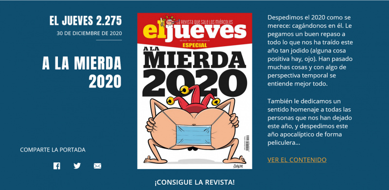 Авторы испанского журнала "El Jueves" (читается как "эль хуэвес", означает всего-навсего "Четверг") обложку номера от 30 декабря сего номера оформили вот так: "Да пошел ты, 2020-й", означает данное выражение. Ну и в тексте справа авторы выражают уверенность в том, что лучшие проводы этого года - нагадить на него. С этим, в общем-то, трудно поспорить.