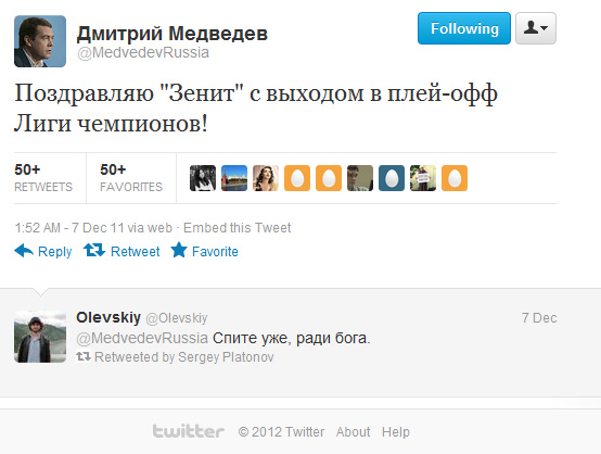 К слову, это Медведев своей идиот"продвинутой" идеей отмены зимнего времени сделал так, что матчи ЛЧ теперь заканчиваются на час позже - в половине второго ночи. Так что, этот комментарий я, как болельщик Зенита, очень даже понимаю...