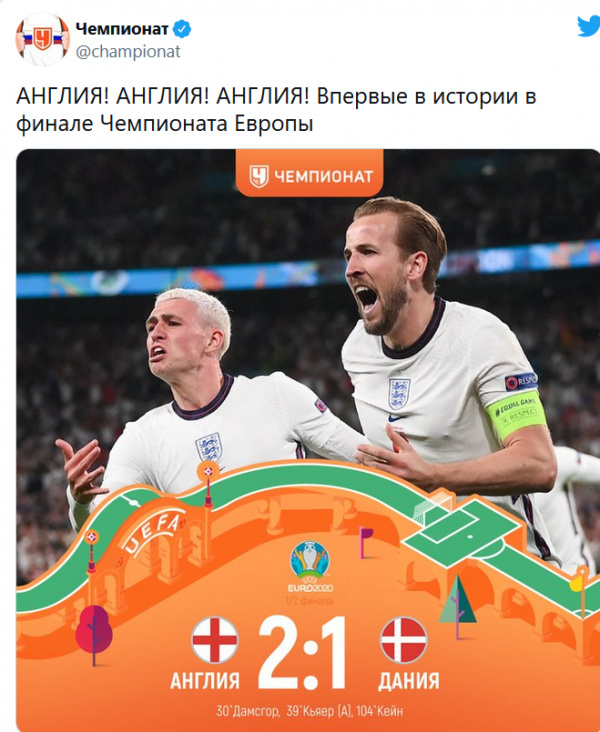Разговоров про то, стоило ли назначать пенальти именно на сто пятой минуте и именно в ворота датчан, которые такие душки, признаться, совершенно не понимаю. Мне в этой паре, безусловно, датчане тоже были симпатичнее, как и большинству нейтральных зрителей. Но у судьи работа такая - овеществлять закон, а не симпатии. В данном матче получилось. Но у датчан, по большому счету, был один шанс - забить и не пропустить. Первую часть они выполнили, а вот не пропустить не смогли. А дальше подсели физически, что и привело к назначению пенальти, защитники не железные. Что поделать, все равно молодцы. Но англичане вышли в финал совершенно по делу.