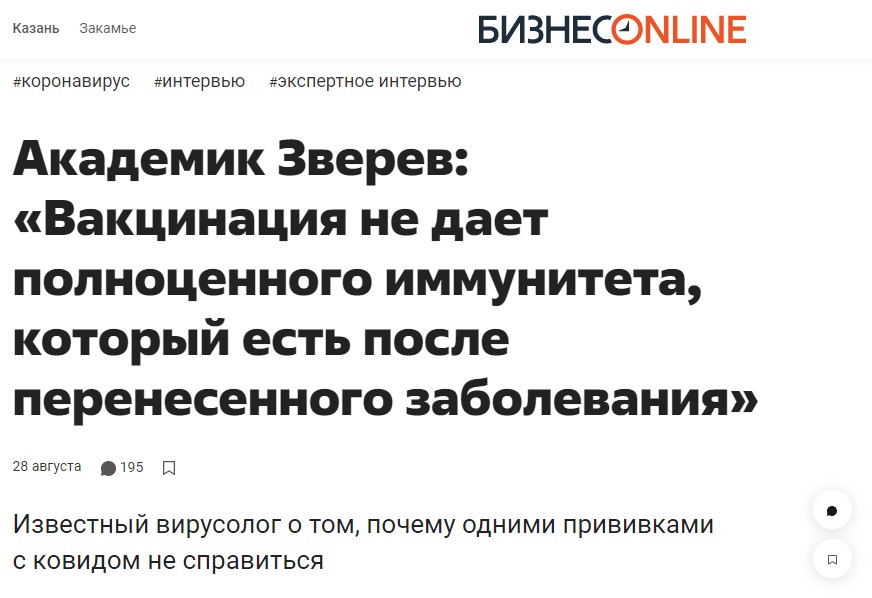 "Через три месяца после вакцинации риск повторного инфицирования в 13,06 раз выше для привитых, чем для тех, кто приобрел антитела, заболев Ковид-19. Риск проявления симптомов для вакцинированных в 27 раз выше, чем для переболевших. "