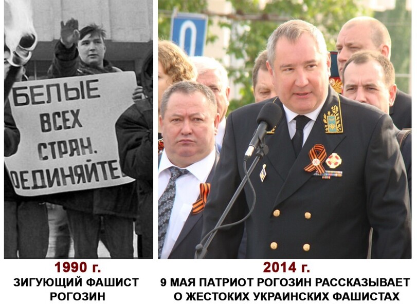 Именно поэтому, чтоб российская публика не замечала, что она построила хрестоматийный фашизм, ей внушается, что это не такой общественный строй со своими признаками, а жесты руками, символы краской и когда с факелом ходят. Вот если этих внешних декораций и бутафории нет, то это, якобы, и не фашизм, а если где-то в других странах есть (или мы по телевизору соврём, что есть), то их надо убивать, там фашизм.