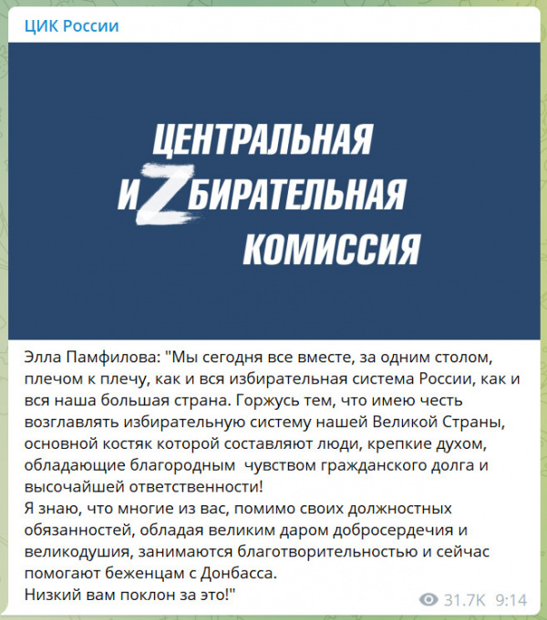 Чиновников на всех уровнях конкретно нагибают, требуя рисовать эту недосвастику в знак поддержки "гуманитарной спецоперации". Избирком быстро прогнулся, а Элла Памфилова выступила с совершенно фееричным заявлением. Дар добросердечия, понимаешь, и великодушия...