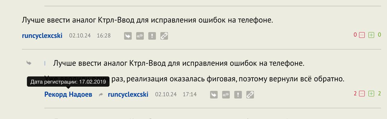 На телефоне по тапу на ник сначала всплывает плашка с датой регистрации, потом без каких-либо доп действий переходит на страничку профиля. Было бы удобнее если бы по тапу всплывала плашка, а уже по тапу по ней переходило в профиль. Надеюсь понятно написал 😄