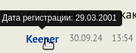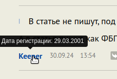 По поводу вот этой записи. Значок неофита убрали (над значком желтых штанов для заслуженных ветеранов думаем, слушаем ваши предложения), теперь по наведению мышки на ник появляется дата регистрации. На мобильнике мышку не наведешь, но можно просто ткнуть в ник - будет выведена открытая информация о нем с датой регистрации (это и раньше было доступно).