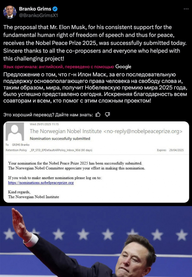 Депутат Европарламента Бранко Гримс выдвинул Илона Маска на Нобелевскую премию мира "за вклад в защиту свободы слова и прав человека". И уже получил подтверждение от Нобелевского института.