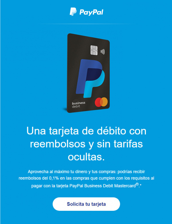 Примерно раз в пару недель PayPal на мой испанский аккаунт присылает на испанском рекламу своей карты-дебитовки с кешбэком.