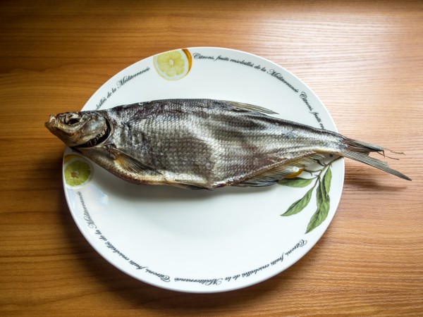 Цвет - серовато-стальной с симпатичным синеватым отливом. Запах - свежий, речной и без раздражающих ноток тины. Ход рыбы при изгибе - пружинистый, упругий, что говорит о высоком качестве высушивания. Чешуя при изгибе слегка потрескивает, но не выпадает, и это свидетельствует о нужной кондиции высушивания и об отсутствии пересушки, весьма негативно влияющей на качество продукта.
