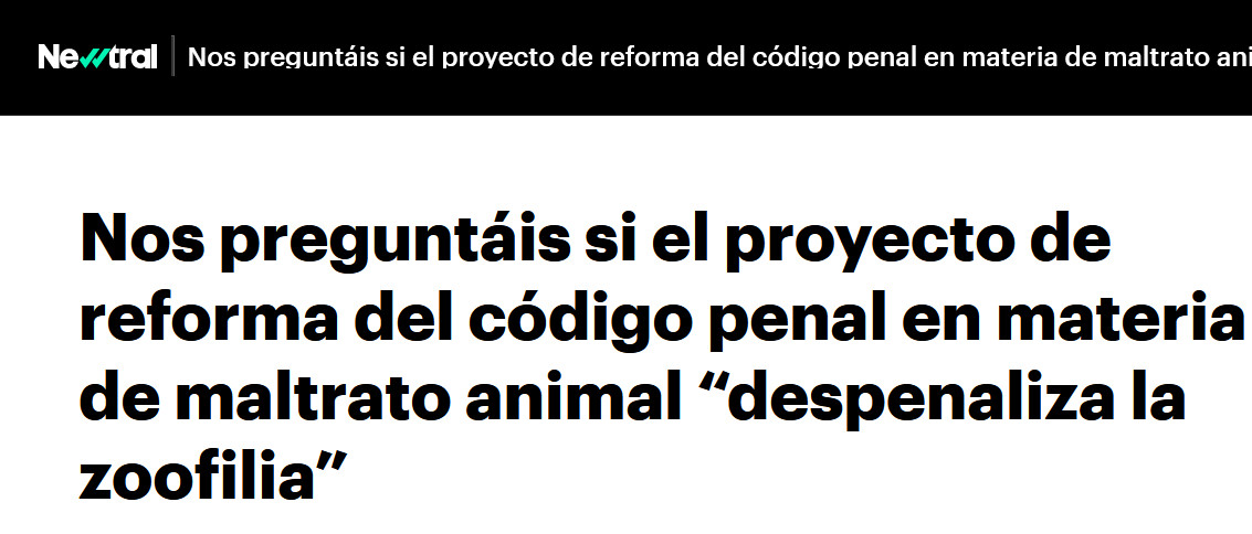 В целом, все наказания ужесточаются за преступления, приводящие к травме или смерти любого позвоночного животного, а также за оставление без присмотра. Однако зоофилия, сексуальные отношения с животными, до сих пор считавшиеся уголовным преступлением, перестанут быть таковыми после реформы Уголовного кодекса о жестоком обращении с животными, одобренной Конгрессом 9 февраля, при условии, что это не причиняет вреда животному.