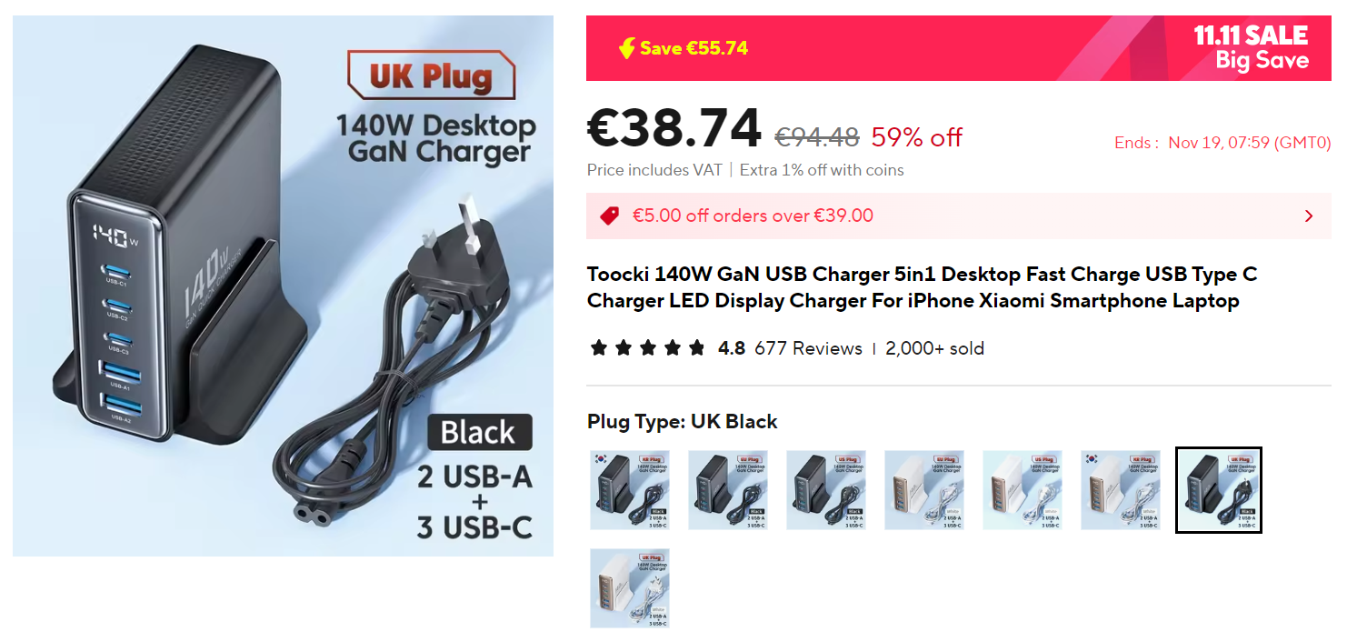Обещают мощность по всем розеткам 2500W, USB Total Power 5V2.4A, Single USB Max Output 5V 2.1A