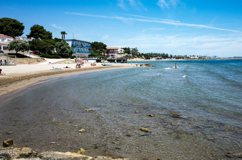 Ну и выделили час, чтобы искупаться на пляже Сант-Карлес-де-ла-Рупита. А пляжи тут знаменитые. Они все имеют голубые флаги ЕС - символ чистоты. Залив мелкий, вода прогревается хорошо, купаться тут можно чуть ли не с апреля-мая. В наших краях купальный сезон начинается в конце июня, а здесь в середине июня вода была +24 градуса. Ну и эти пляжи отлично подходят для семейного отдыха: детишкам тут намного комфортнее, чем на открытых морских пляжах, где довольно быстро становится глубоко. А тут хоть весь залив можно пройти. Вода при этом - чистейшая. Единственное - надо смотреть под ноги. Где-то попадаются области дна с ракушками, там можно поранить ноги. Но стоит пройти чуть в сторону - чистейшее песчаное дно. И на пляжах песок - мельчайший.