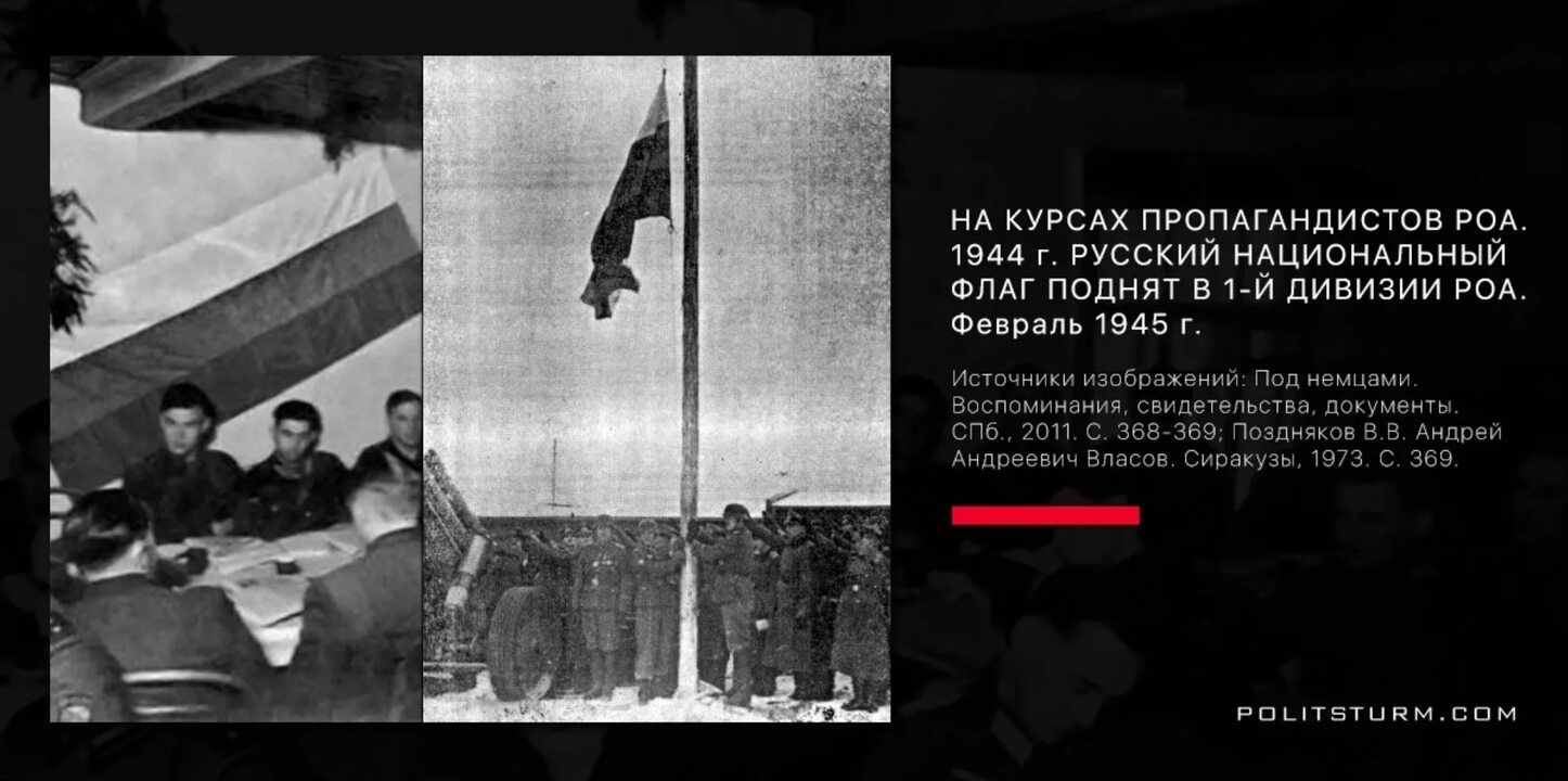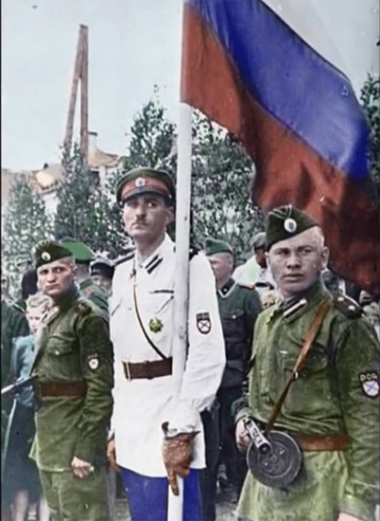 Википедия говорит обратное: "При формировании русскоязычных военных подразделений были попытки использования в эмблематике триколора, двуглавого орла, белого, синего и красного цветов, что было запрещено германским командованием. В связи с этим, главным русским национальным символом, использовавшимся во власовской Русской освободительной армии, стал не бело-сине-красный, а Андреевский флаг, появившийся на нарукавных эмблемах РОА. Над лагерем Дабендорф, в котором происходило формирование русскоязычных соединений в 1943 году, рядом с немецким флагом располагался Андреевский флаг[4], что подтверждено документальными фотографиями. Также Андреевский крест использовался в пропагандистской печати РОА."