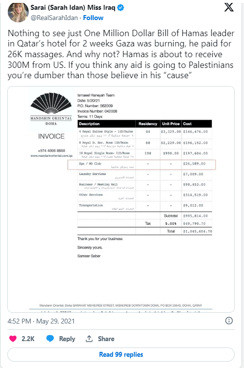 Делегация "ХАМАС" приехала в Катар обсудить перемирие в Секторе Газа. Пятизвездочный отель Mandarin Oriental. За 11 дней нагуляли более чем на миллион. Рестораны и бары - $315,5 тысяч, СПА - $26,5 тысяч.