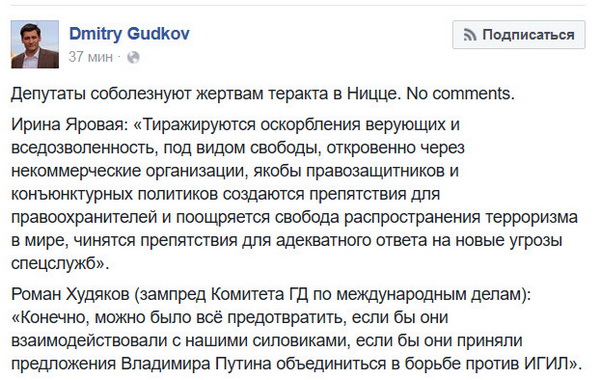 "Трагедия всего мира состоит в том, что из-за непрекращения череды террористических атак соболезнования вошли в привычный ритуал светской хроники, за которым, спустя буквально несколько дней, снова начинается шабаш безответственности и бездействия, манипуляции сознанием и информационной лжи."