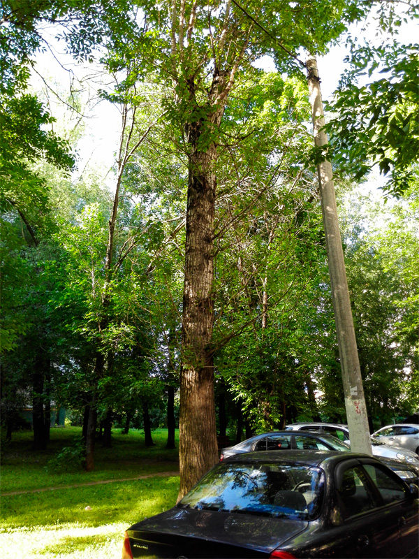 Вот это дерево посадил я. То ли во втором, то ли в третьем классе. Срезал прутик с дерева, поставил в бутылку с водой. На прутике проклюнулась почки. Потом во дворе был субботник, я вынес этот прутик и его посадил. Как ни странно, деревце выросло. Даже я бы сказал - вымахало.