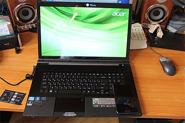 Приехала моя прелес-с-с-сть - дескноут Acer Aspire 8951G. Galaxy Note на нем лежит для сравнения масштабов.