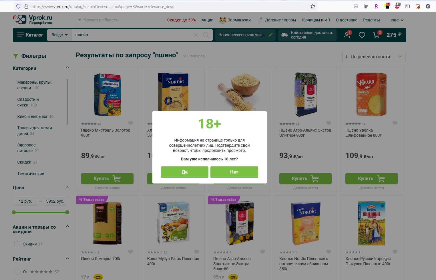 при поисковой выдаче, чуть ниже, после шоколада и печенья, будут алкогольные напитки, покупка которых возможна только при 18+.