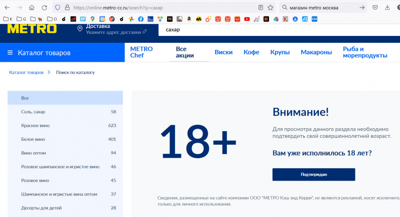 Класс. На российском сайте магазина METRO при попытке найти "сахар" требуют подтвердить, что вам уже исполнилось 18 лет. А вот соль без подтверждения пока дают найти, пока разрешается.