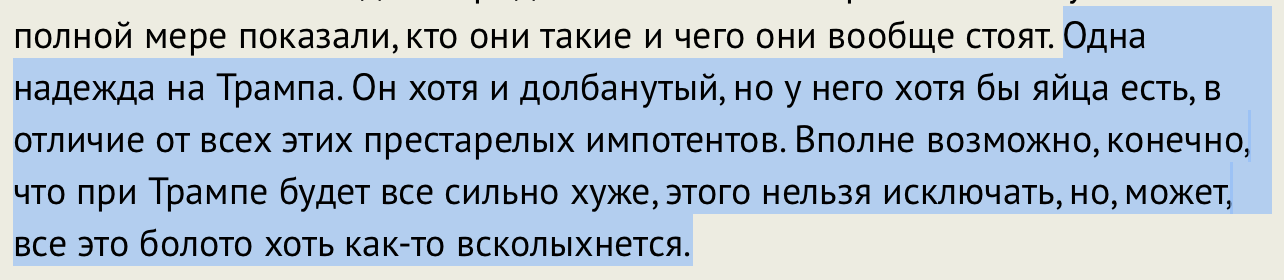 Мне нравятся оптимисты; но тут есть нюанс - мы уже видели Трампа-президента. Я старался не дать ему вторую попытку, вы, видимо, наоборот.