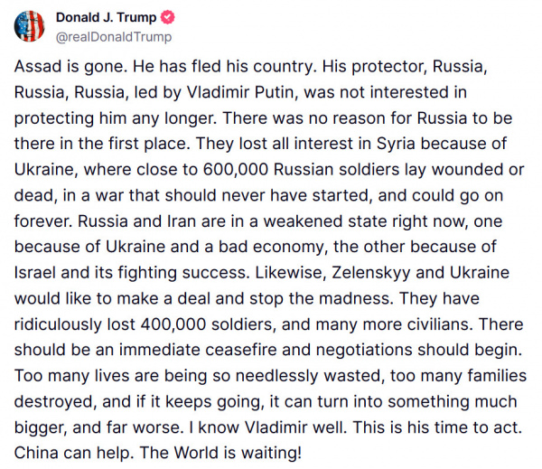 Асада больше нет. Он бежал из своей страны. Его защитник, Россия, Россия, Россия во главе с Владимиром Путиным, больше не была заинтересована в его защите. России вообще незачем было там находиться. Они потеряли всякий интерес к Сирии из-за Украины, где около 600 000 российских солдат лежат ранеными или мертвыми в войне, которая никогда не должна была начаться и может продолжаться вечно. Россия и Иран сейчас находятся в ослабленном состоянии, одна - из-за Украины и плохой экономики, другой - из-за Израиля и его боевых успехов. Зеленский и Украина тоже хотели бы заключить сделку и прекратить это безумие. Они нелепо потеряли 400 000 солдат и гораздо больше мирных жителей. Необходимо немедленно прекратить огонь и начать переговоры. Слишком много жизней без нужды унесено, слишком много семей разрушено, и если так пойдет и дальше, это может перерасти в нечто гораздо большее и гораздо худшее. Я хорошо знаю Владимира. Сейчас его время действовать. Китай может помочь. Мир ждет!