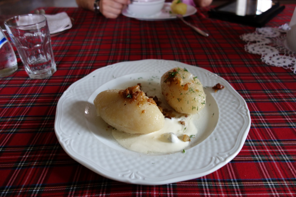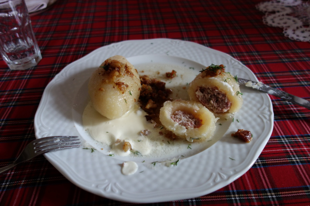 Ну и коронное блюдо - цеппелины. Это такие здоровенные клецки из картофеля (нужен особый сорт, содержащий много крахмала, чтобы картошка не развалилась), фаршированные мясом (также иногда фаршируются творогом). Подаются с отдельно поджаренным то ли беконом, то ли грудинкой, поливаются маслом и сметаной. Блюдо очень сытное и тяжелое - ну, северяне, когда холодно, требуется очень калорийная еда, чтобы согреться.