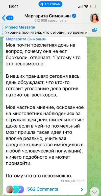 Сейчас пойдут валом сообщения о гибели мобилизованных, и это будут не десятки, как сейчас, а тысячи смертей, которые очень трудно скрыть. По мнению Вовк самый надёжный способ это даже не фильтрация того что несут "военкоры", а прямая зачистка всего информационного пространства, вот просто есть только сообщения пресс-службы МО, а всех остальных просто тут же сажать. Это первый шаг. Дальше будет дело поставленное на поток, и да, если боброедка не затянется, то и ее под статью подпишут.