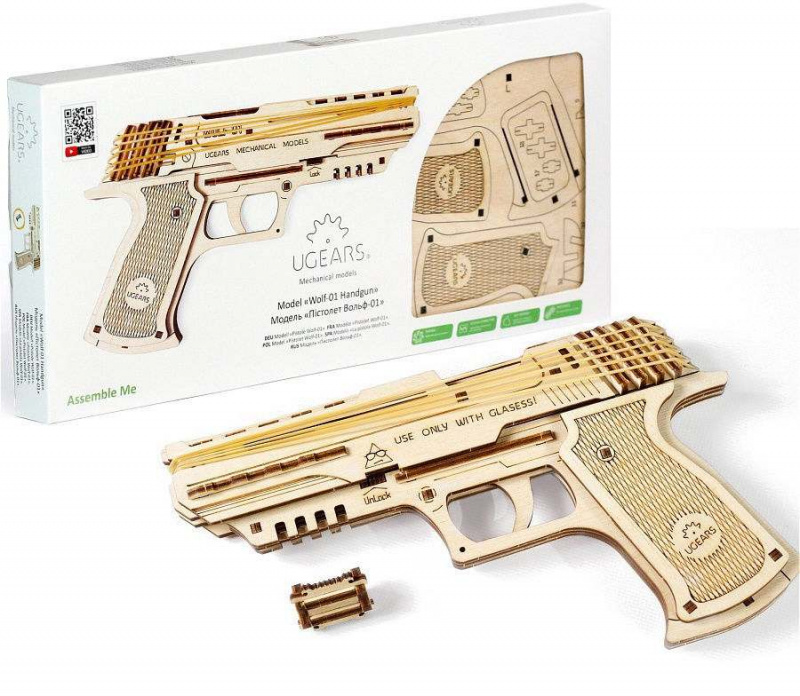 Почти все хорошо в конструкторах UGEARS - красивый дизайн и качественные фанерные детали. Единственный и довольно существенный недостаток это низкокачественные резинки, рассыхающиеся и лопающиеся через пару месяцев. Собирал два конструктора (пистолет и машинку Grand Prix), в обоих абсолютно все резинки накрылись медным тазом. В пистолете резинку поменять довольно легко из-за простоты самой конструкции, но разбирать автомобиль... проще выбросить.