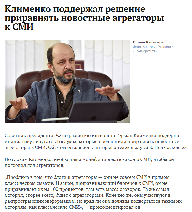 Клименко не одобряет контент новостных агрегаторов, связанный с его комментариями про закон о них