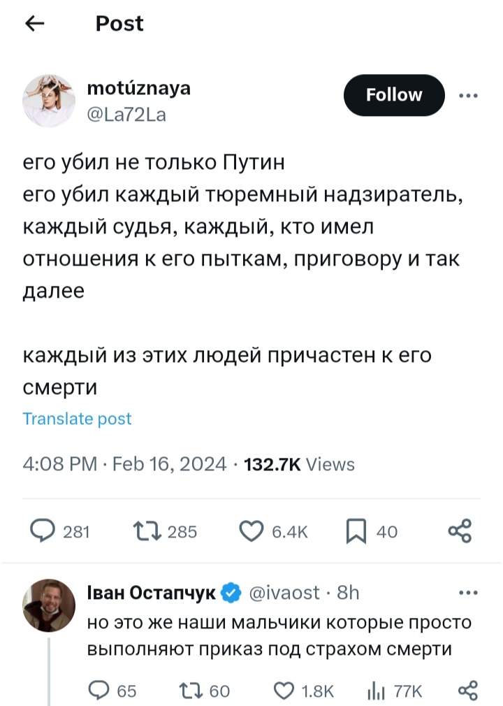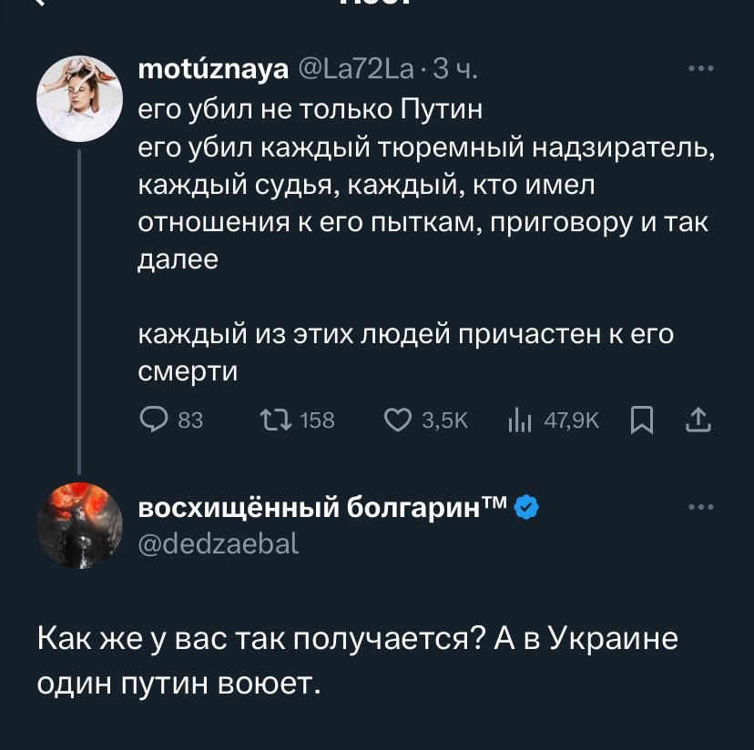 "Ну конечно это ужасно. Молодой совсем, семья. Но ведь он понимал что тюрьма не сахар. Причём тут политический? Там же кировлес и лореаль - мошенничество, чистая уголовщина. Ну а потом дыма без огня не бывает, он же образование в Америка получал, там и завербовали. А вот так враг и выглядит, обаятельным, без рогов и копыт. И по факту, что он хорошего стране сделал, хоть одно дело назови? Только раскачивал, а кому такое понравится? Байден или твой Макрон думаешь не так же поступили бы - отработанный материал! Ну вот и история с отравлением, все же понимают кто это сделал. Сейчас особенно с этим строго, война всё же. Хотя сначала был проект Кремля, на обе стороны работал, а таких нигде не любят. Так что финал очевиден. Ну конечно это ужасно. Молодой совсем, семья."