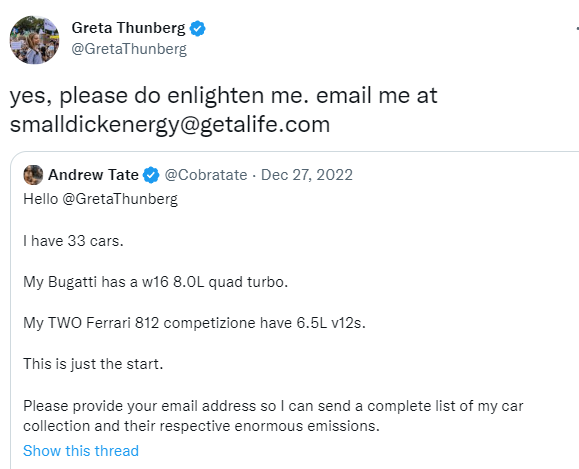 Помните недавнюю историю о том, как некий Эндрю Тейт, которого давно разыскивала полиция по подозрению в сексуальном насилии и торговле людьми, затеял публичную перепалку с Гретой Тунберг, которой он предложил прислать полный список своей коллекции автомобилей? Грета на это заметила, что у Эндрю явно очень маленький писюн, раз ему приходится сублимировать подобным образом. Тейт совсем разозлился и записал ответное видео, в котором была хорошо видна коробка из-под пиццы с названием производителя и адресом доставки, после чего Эндрю арестовала полиция, а вчера сообщили, что его машины конфискованы.